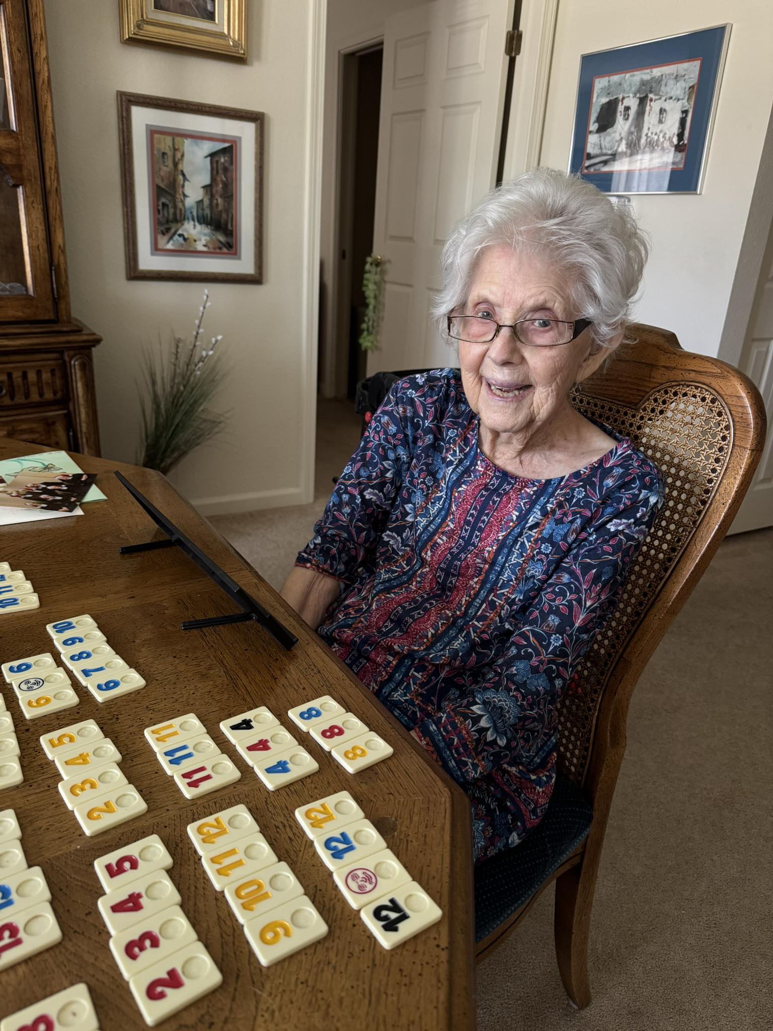 Willie Maude was born in the age of the Model T. She still possessed a sharp mind and wit into the age of Artificial Intelligence. It was one sharp enough to very recently run the table at a game of Rummikub against one hopelessly outmatched son (me); even at age 100 she still laid down the square tiles like a champ. For much of her adult life, that mind and a creative spark evidenced itself in her luminous art pieces, dozens of which are in the hands now of her children and grandchildren, as well as remarkable quilts. She was particularly proud of her water colors. They are numerous and varied: small studies of flowers, impressionist portraits of New Mexico or Oklahoma landscapes, seaside scenes or sailing ships, street vendors hawking their wares, and much more.